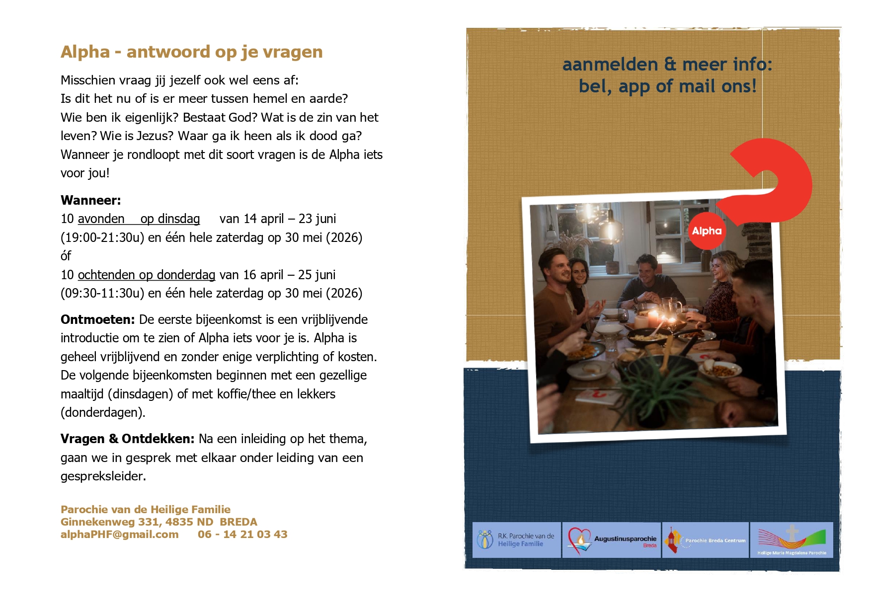 Centraal staat dat we ons geloof verdiepen, Jezus (beter) leren kennen, vreugde van het geloof delen en vriendschappen opdoen. We hopen zo een fijne gemeenschap te beleven in een jarenlang band met elkaar.