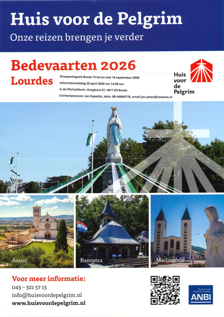 In 2026 willen we weer met een groep pelgrims vanuit Breda en omgeving op bedevaart naar Lourdes. We hebben hiervoor 25 plaatsen gereserveerd voor de bedevaart per vliegtuig van 13 tot en met 18 september 2026 bij Het Huis voor de Pelgrim. De reis zal pastoraal begeleid worden door pater Richard Lobo.